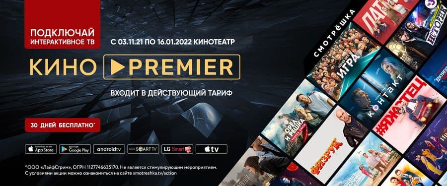 Если у вас ещё нет интерактивного ТВ, подключайте и смотрите более 300 ТВ-каналов и 6 онлайн-кинотеатров в одном приложении, а после окончания тестового периода подписка PREMIER останется с вами до 16 января!
